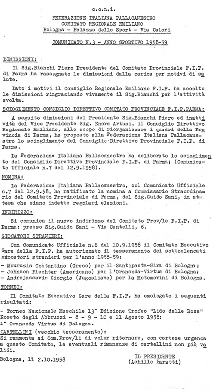La commissione tecnica della F.I.P., nelle sue ultime riunioni ha sospeso da ogni attività federale, per mesi sei, a far data dall’8 giugno 1958, il giocatore Johnson Fletcher (SEF Virtus Bologna), in prestito per il torneo alla squadra del S Agostino Bologna, perché durante la gara S. Agostino-Ignis Varese nel torneo maschile Interomnia disputato a Teramo nei giorni 7-8 giugno u. s., colpiva un giocatore avversario dal quale non era stato provocato, causandogli una lesione.