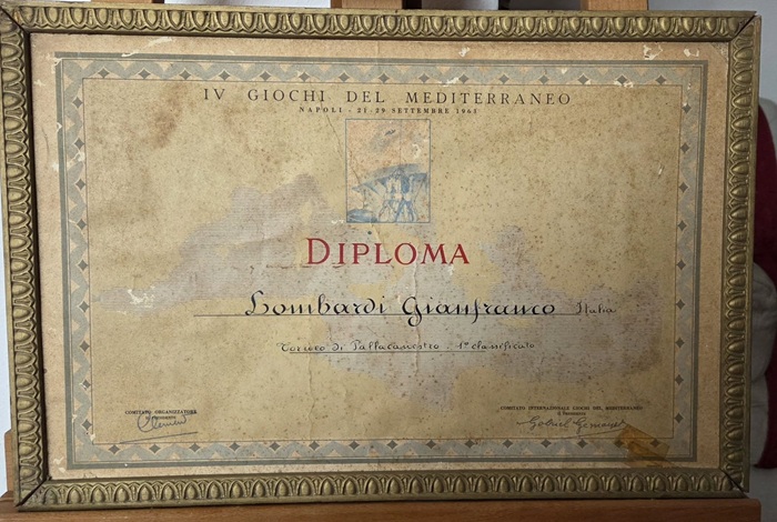 Il diploma di Gianfranco Lombardi per la vittoria con la Nazionale ai Giochi del Mediterraneo del 1963 (foto fornita da Lisa Lombardi e Salvatore Romeo, rispettivamente figlia e genero di Gianfranco)