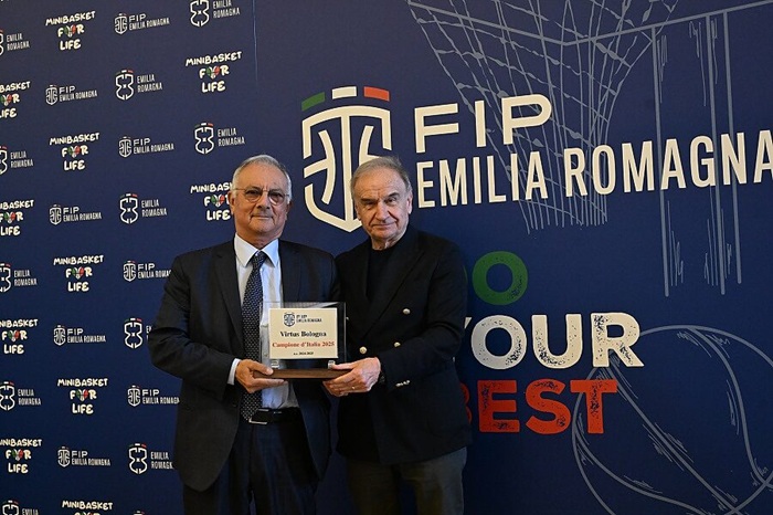 A Castel San Pietro, nel Palazzo di Varignana, il 15 novembre 2025 il presidente FIP Petrucci consegna a Giuseppe Sermasi la targa FIP Emilia Romagna per lo scudetto tricolore 2024/25