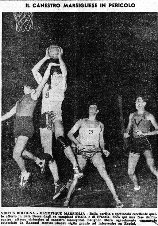 La Sala Borsa ieri non poteva meglio riaprire i suoi battenti alla pallacanestro: una bella partita ed un largo concorso di pubblico. Rispondente all'aspettativa la simpatica squadra marsigliese dell'Olympique; superiore alle previsioni la prestazione della Virtus. Ha vinto, e meritatamente, la compagine bolognese che pure non ha fatto in tempo ad allineare Negroni e Dino Zucchi, così come non è sceso in campo Marinelli del quale pure era stata annunciata la presenza e che molto male ha fatto a non schierarsi.